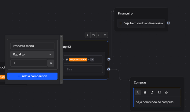 Ao criar a variável agora, vamos criar nossas condição que vai determinar o fluxo de nosso chat, por exemplo se a variável que criamos anteriormente ‘resposta-menu’ for igual a 1 vai para o financeiro.