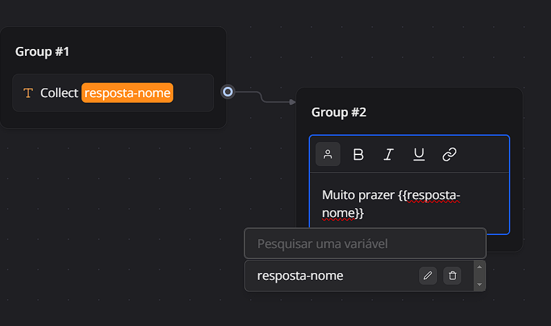 As variáveis são utilizadas para armazenar informações relevantes para a interação do chatbot. Elas podem ser criadas dinamicamente durante a conversa, geralmente a partir das respostas dos usuários aos “inputs”. Por exemplo, ao coletar o nome do usuário por meio de um “input” de texto, essa informação pode ser armazenada em uma variável para uso futuro. Vejamos algumas formas de criação de variaveis: